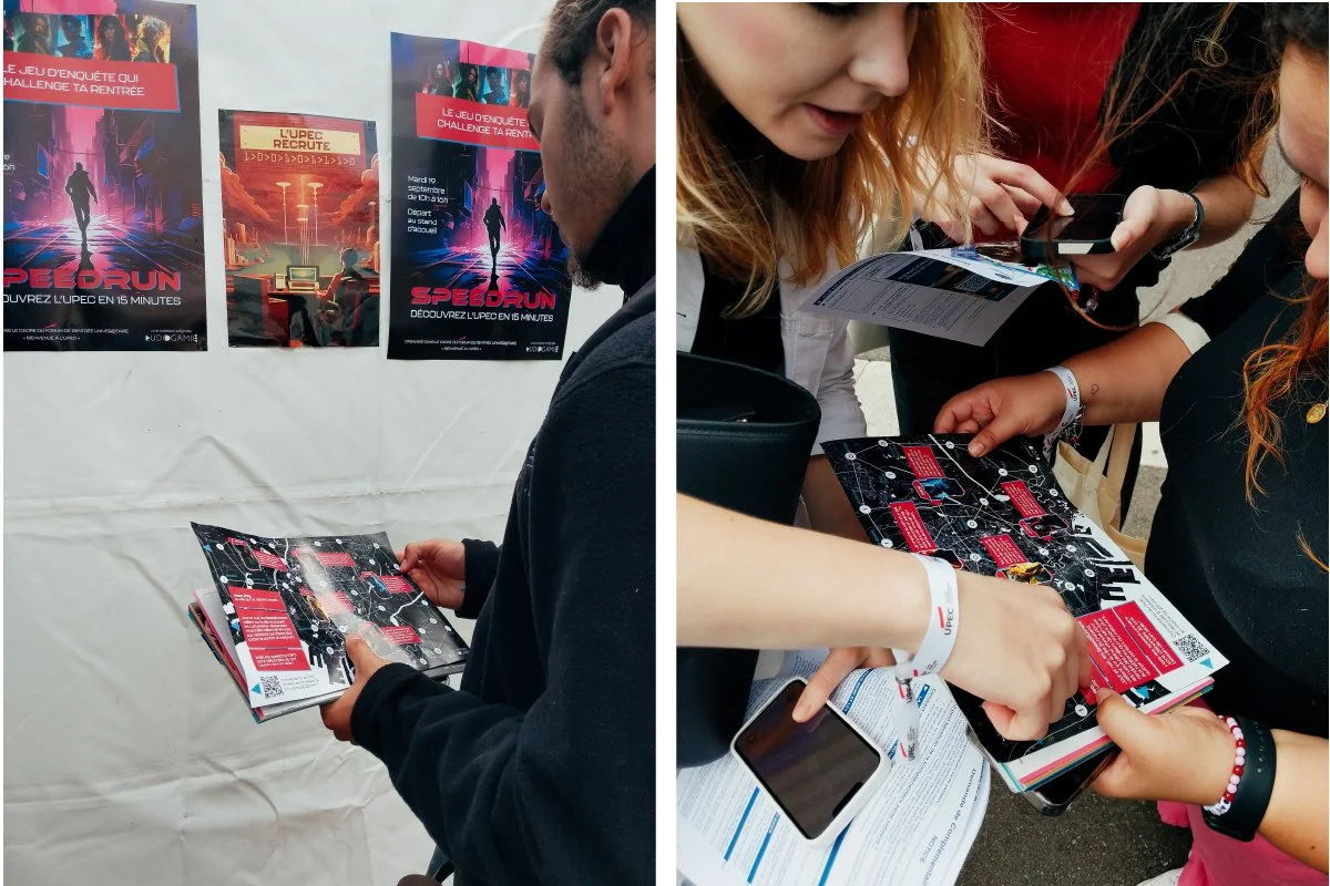Speedrun a été un jeu extrêmement plaisant à imaginer. Le challenge était d’allier une expérience de jeu intense et un univers fort, tout en intégrant la demande de notre client. Nous nous sommes appuyés sur une web-app, des éléments de jeu disséminés entre les stands et des personnages engageants. La durée de jeu fut parfaite pour capter un public d’opportunité. Les étudiants ont adoré !